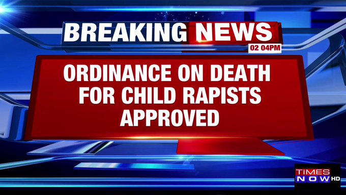 सरकार ने अप्रैल 20 को सुप्रीम कोर्ट में बताया कि 12 साल तक की बच्चियों के साथ दुष्कर्म के मामले में अधिकतम मौत की सजा का प्रावधान करेगी। सुप्रीम कोर्ट में एक जनहित याचिका लंबित है जिसमें छोटे बच्चों के साथ दुष्कर्म पर चिंता जताते हुए कानून को कड़ा किये जाने की मांग की गई है। ये याचिका वकील अलख आलोक श्रीवास्तव ने दाखिल की है।कोर्ट ने इस याचिका पर सरकार से जवाब मांगा था। सरकार की ओर से अप्रैल 20 को एडीशनल सालिसिटर जनरल के जरिये एक नोट पेश कर बताया गया कि सरकार POCSO कानून में संशोधन कर 12 वर्ष से कम उम्र के बच्चों से दुष्कर्म के दोषी के लिए मृत्युदंड का प्रावधान करने पर विचार कर रही है।